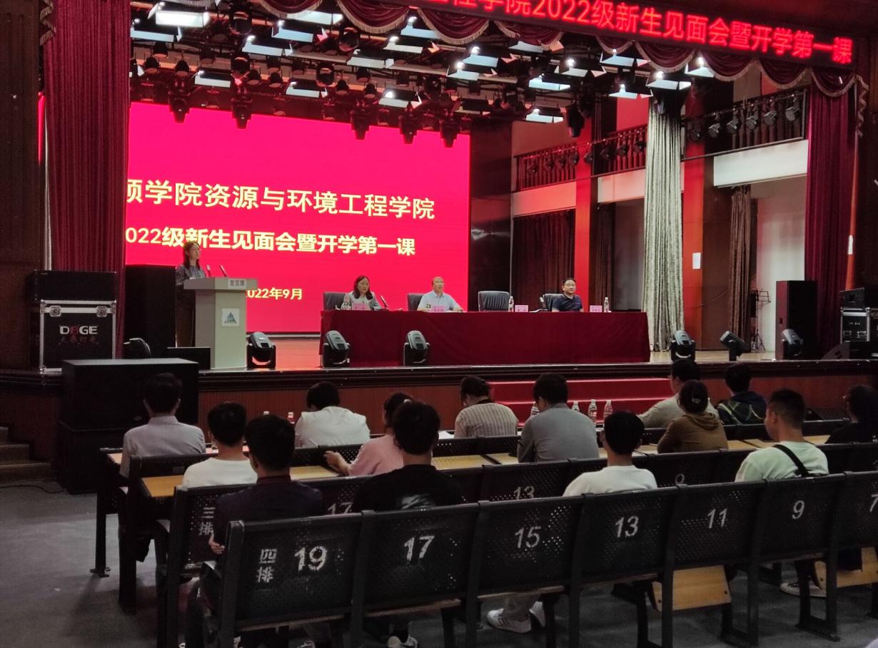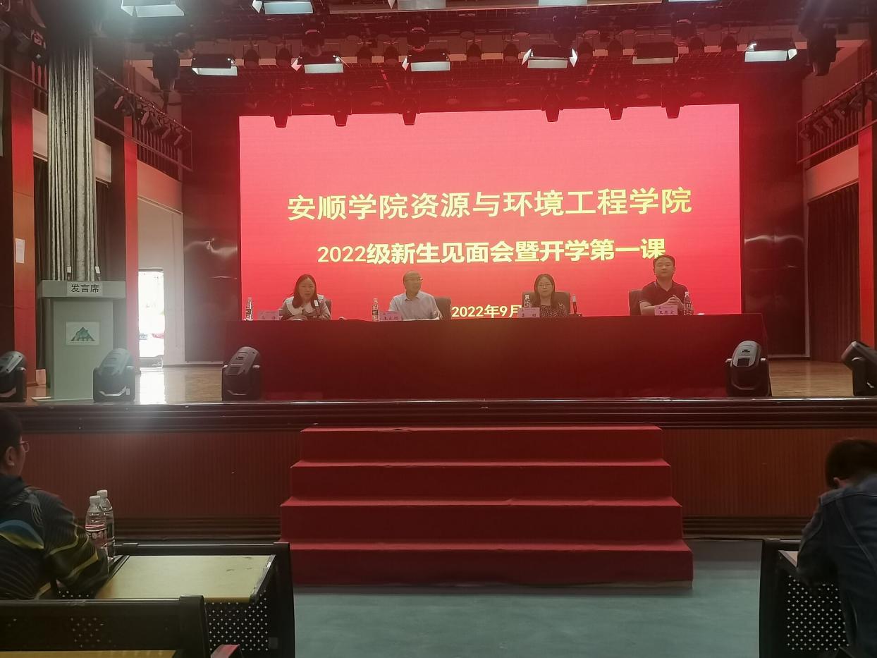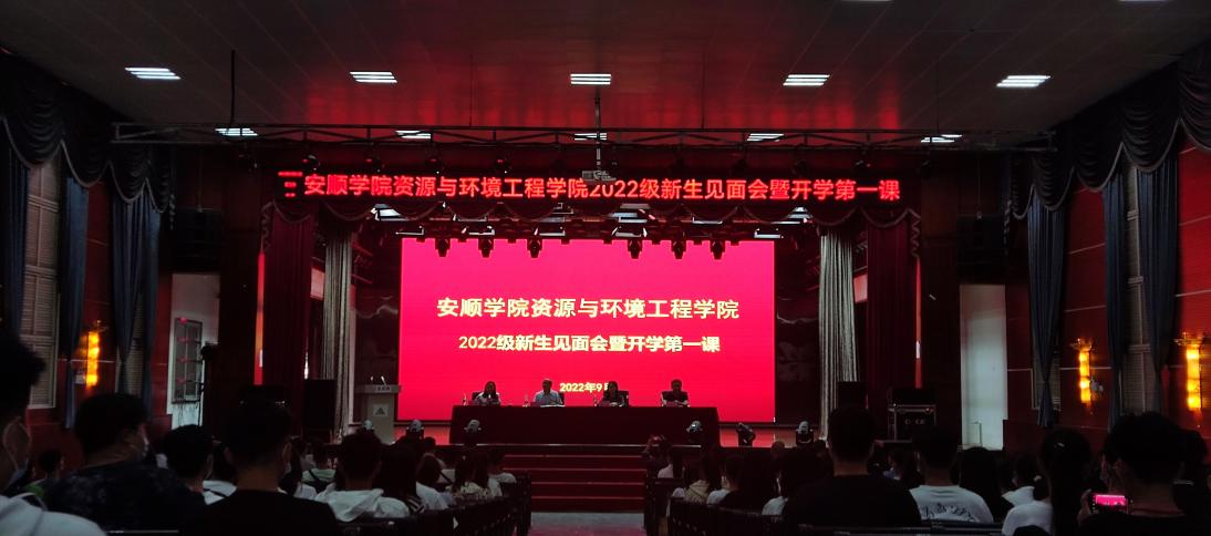 2022年9月1日下午一点,安顺学院资源与环境工程学院2022级新生见面会暨开学第一课在大礼堂召开。参加会议的人员有党委书记王家顺,院长娄昭,党委委员、副院长王恩文,党委专职副书记韦静,党委委员、教学科研与实践管理科科长谢成德以及资源与环境工程学院全体教师、2022级全体新生。此次会议由党委专职副书记韦静同志主持。