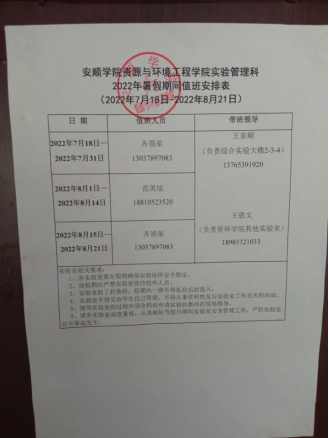 此外,实验室制定了值班表,深刻认识、高度重视实验实训室安全工作抓好实验室安全工作的极端重要性,不断强化安全红线意识,时刻绷紧安全这根弦,坚决克服麻痹思想和侥幸心理,确保认真做好暑假期间实验室安全管理工作,严防实验室安全事故发生。(文:范英旭 图:齐领弟)