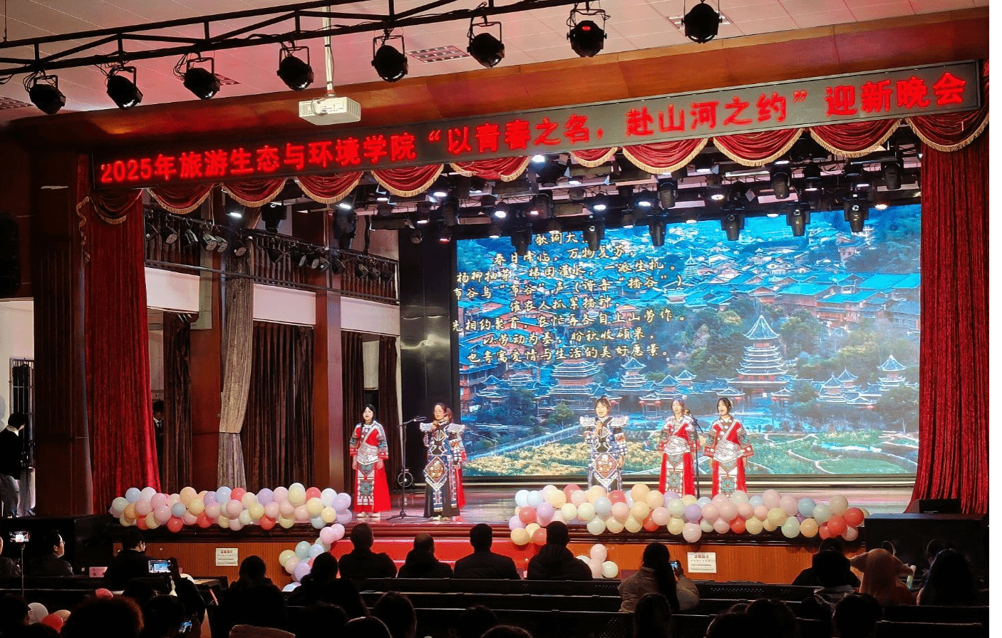 2025年12月15日晚,旅游生态与环境学院2025年“资环之光”迎新晚会在学校礼堂精彩上演,学院党委书记王家顺、学院副院长尹科、学院党委专职副书记张家刚以及班主任、辅导员等老师到场观看。