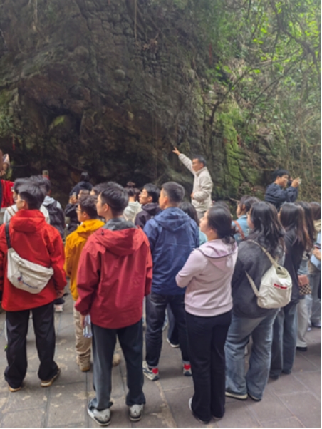 实习首站师生抵达全国唯一的水族自治县——三都。同学们首先参观了被誉为“世界未解之谜”的产蛋崖,亲眼目睹了崖壁上嵌着的数十枚“石蛋”,对其成因的地质猜想与当地水族村民赋予它的神秘传说进行了初步了解与记录。